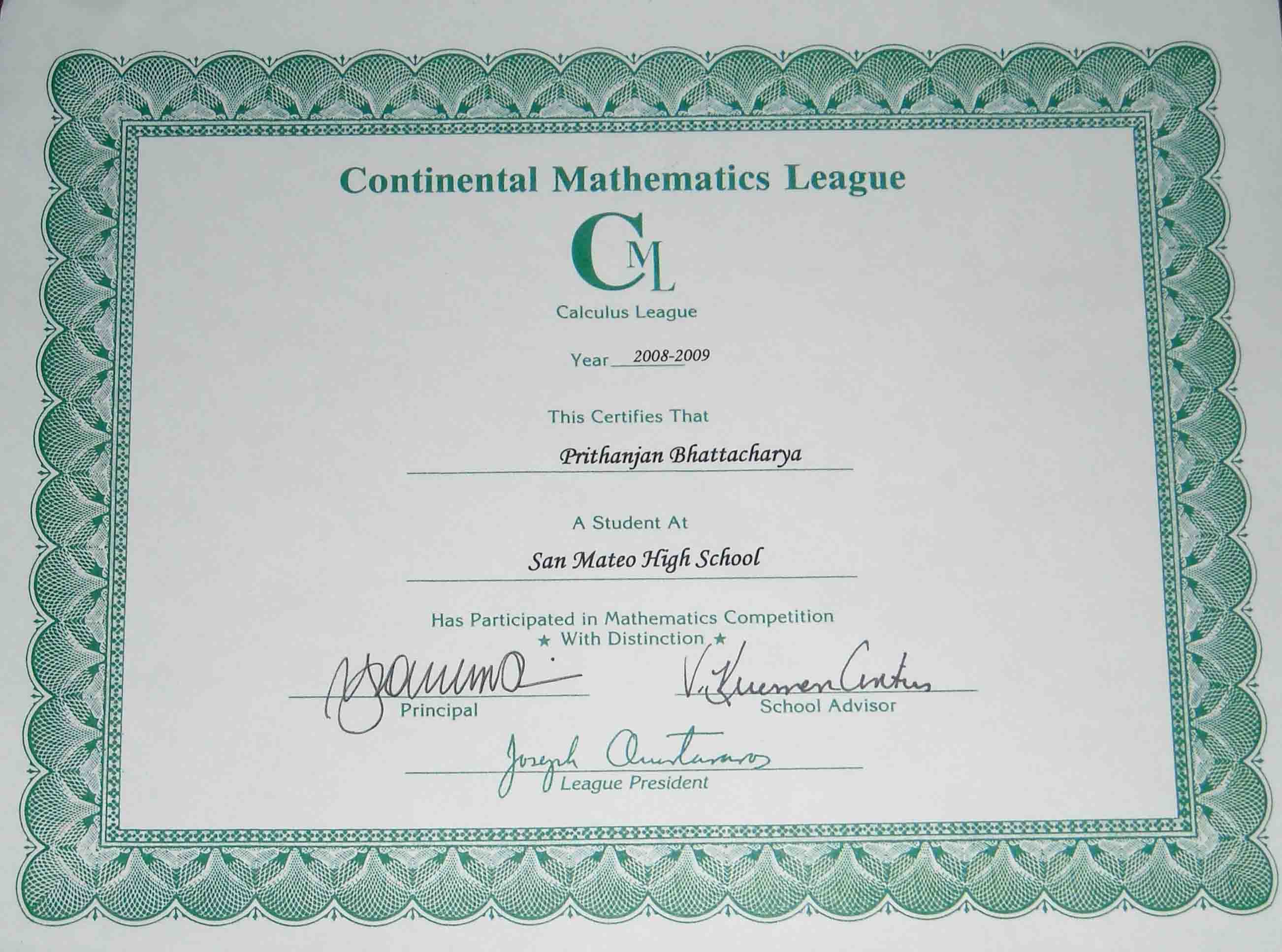 Gold AwardNational Top 10. It means that at the end of year awards ceremony he will get a certificate that says he did well on the Continental Math League test. The constest consists of three meets six questions for 30 minutes in each meet.